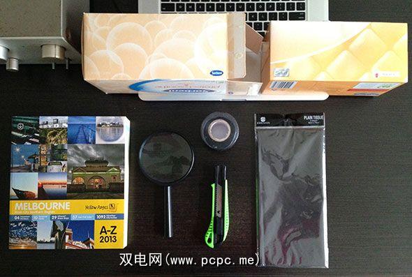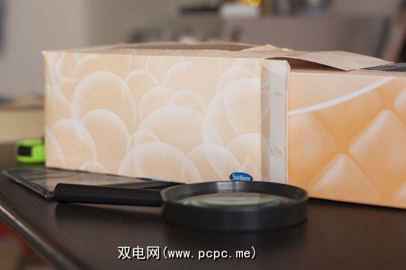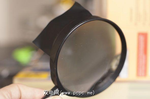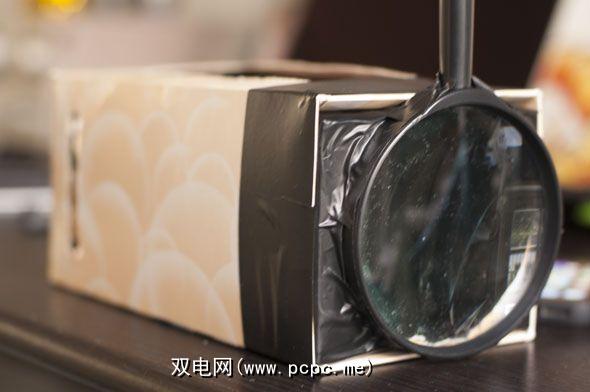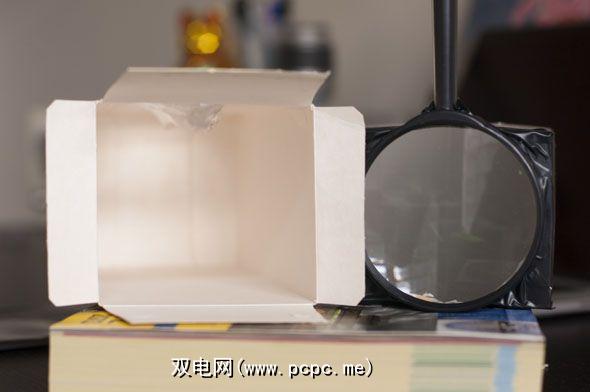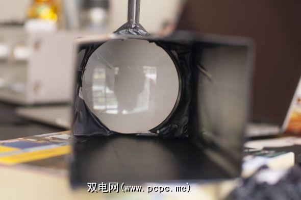 将放大镜宽松地固定在适当的位置,用胶带将剩余的边缘用胶带封住,以密封所有可能漏出光的孔。