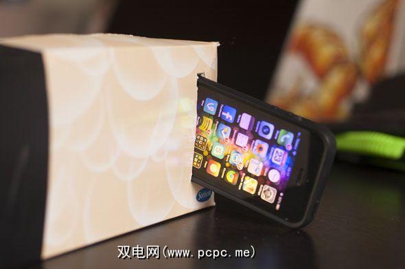 最后现在是时候将手机放置到位进行快速测试了。您可以在这里使用从临时用纸架到回形针甚至是蓝色大头钉的任何东西,但是我很幸运地拥有一个比iPhone 5的宽度稍小的盒子,这意味着我可以在原始投影仪上做得更好