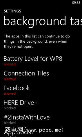对于使用诺基亚Lumia 920的任何人,您都可以管理哪些应用程序可以保留在后台运行设置,滑动到应用,然后打开背景任务。查看列表,查找使用GPS的游戏和服务,例如Here Drive。要阻止某个应用,请点击它以查看状态屏幕,然后点击阻止。这将有很大帮助,您可以通过按住“返回"来检查哪些应用已关闭。