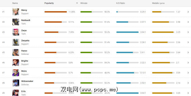 在“守望先锋"竞赛中,您越能对付最常用的英雄,就越有可能击败玩家。这就是为什么像MasterOverwatch这样的网站会提供按季节统计的按受欢迎程度,获胜率,K / D比等排序字符的原因。
