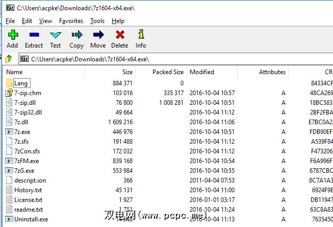 您可以通过使用7-Zip打开档案来检查EXE或MSI的内容。如果使用它查看7-Zip自己的EXE安装程序,则会在以下位置找到许多不同的文件: