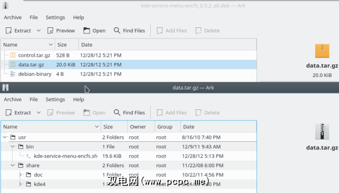 要看一下DEB文件的内部,可以尝试使用GUI存档管理器。否则,请使用 ar 命令。在终端中输入以下命令将提取Debian软件包的内容: