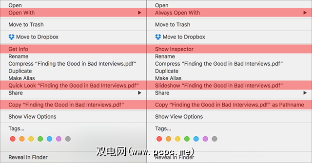 在左侧,您有一个右键单击PDF文件时会出现的常规上下文菜单。在右边,您会右键单击相同的文件,只是这次同时按住了Option键。看到其他选项了吗?非常方便。