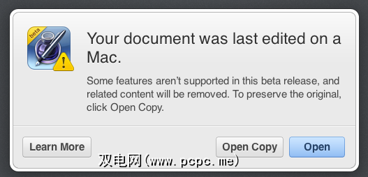 适用于OS X和iOS的iWork的大多数主要功能在iCloud版本中可用,但不是全部。在当前的Beta版本中,将提醒您,将删除iWork for iCloud不支持的功能。这就是为什么当系统询问您是否要打开在线文件的原始版本或创建副本时,应选择“打开副本"的原因。