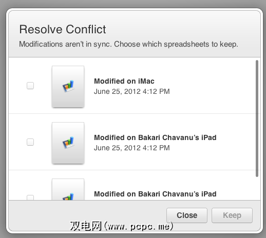 iWork for iCloud还允许您像在Mac上一样导入Word,Excel和PowerPoint文档。如果文档版本之间存在冲突,则iCloud将允许您选择要解决该冲突的文档。