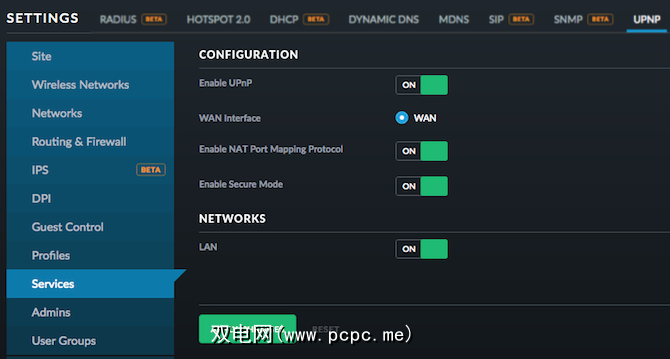 例如,在我的Unifi安全网关上,我可以在设置>服务> uPnP 下找到该选项。如果存在该选项,则同时启用UPnP和NAT端口映射。这是Linksys和Netgear路由器的说明。如果您来自其他制造商,则只需Google搜索“ enable upnp",后跟路由器制造商的名称。