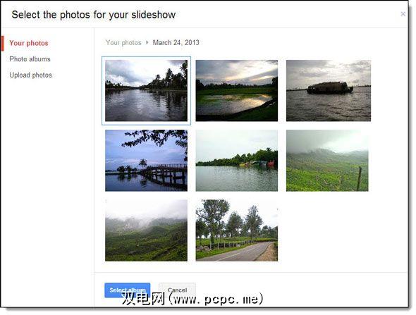 3。为您的YouTube幻灯片选择照片。 Google自动为您提供从Google+或Picasa网络相册中导入已保存照片的第一个选项。 (从今年3月起,Picasa网址重定向到Google+,因为Google+极有可能集中照片共享。)