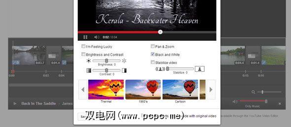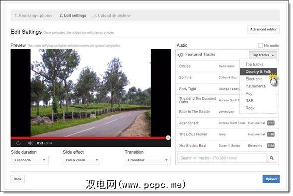 幻灯片创建者是不言自明的。您可以设置幻灯片持续时间,幻灯片效果和过渡。如果您想在视频中添加一些音乐动感,则YouTube还为您提供了15万首曲目,供您选择背景乐谱。如果不是,请使用无音频选项。 YouTube不允许您上传自己的音频文件。