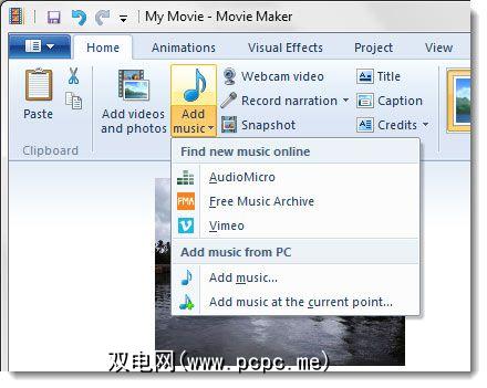 5。 Windows Movie Maker还可让您上传音乐或从添加音乐菜单上的免版税音乐网站中获取音乐。