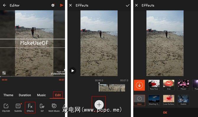 您是否曾经想在Android视频中添加闪电或气泡? VideoShow只需几个简单的步骤即可实现这一目标。选择视频后,找到并点击“编辑"标签。在这里,您会看到可以添加到视频中的所有效果。