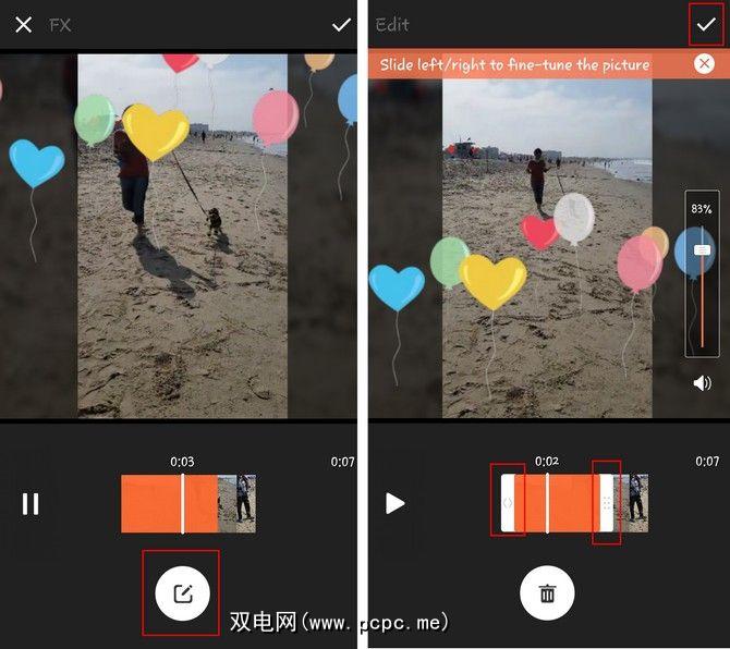 当您具有想要的效果时,选择它并在下面点击对勾标记顶端。要延长效果的持续时间,请点击底部的铅笔按钮,然后拖动滑块的白色边。