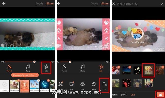 选择编辑剪刀图标> FX> FX白色圆圈>选择效果。因此,如果是第一次使用该应用程序,则只有几个选项。要购买更多商品,请点击右下角的橙色袋子图标,然后浏览各种各样的效果。