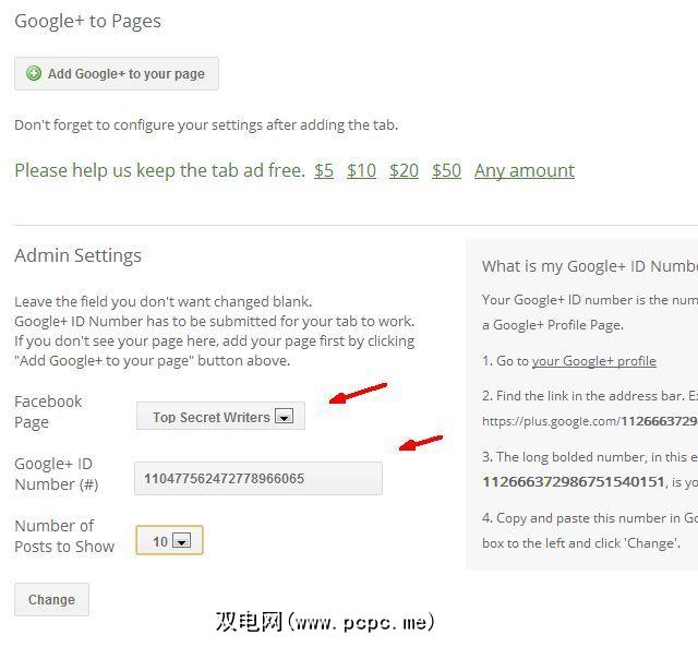 在该应用的设置页面上,选择要推广您的Google+帐户的Facebook粉丝页面,粘贴刚刚复制的ID从您的Google+网址中,设置要推广的Google+订阅源中有多少更新,就完成了!