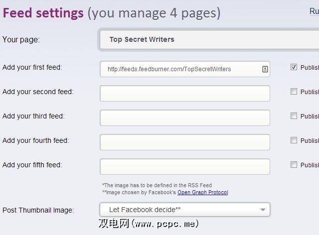 要实现此目的,您可以使用任意数量的Facebook粉丝页面RSS feed应用程序。我个人选择的一种称为SocialRSS。当您访问应用程序页面时(再次使用您的个人Facebook帐户,而不是粉丝页面),您会看到一个页面,您可以在其中快速设置一到五个供稿源。