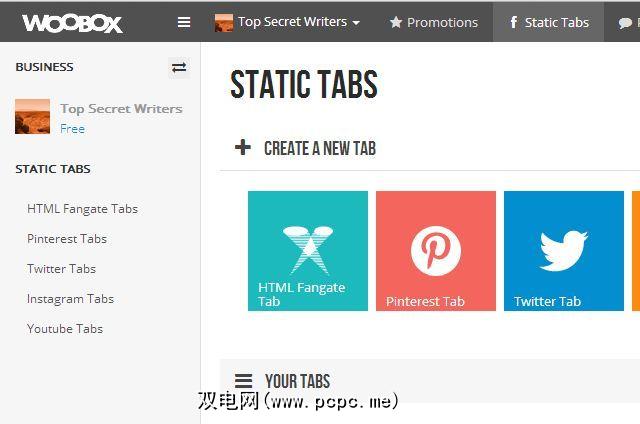 点击Woobox应用程序页面,添加应用程序,为其提供所需的权限,然后您将在Woobox配置页面上找到自己。单击“静态选项卡"以获取没有高级帐户可用的免费选项卡的列表。幸运的是,这些免费选项卡包括最重要的选项卡-Twitter。