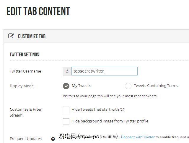 Add the Twitter tab, and you’ll find yourself on the Edit Tab Content page. Just type in the username of the account that you want to promote from your fan page, and configure how the tweets will be displayed inside Facebook.