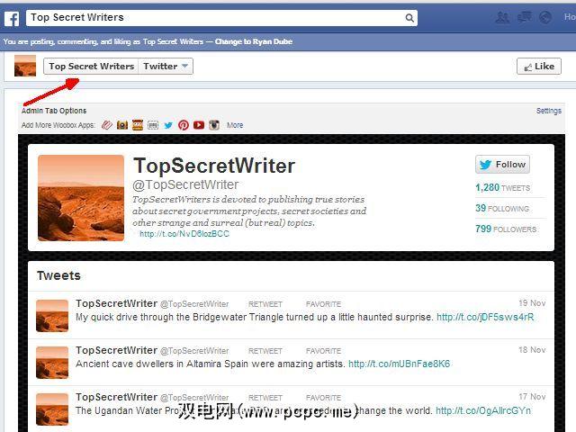 现在,当您点击该新标签时,它将带您进入粉丝页面内的特殊页面(一个标签),您将在其中看到所有最重要的供稿。最近的Twitter更新。这是一种在Facebook上“联合"您的Twitter更新的很棒的方法,因此您的粉丝现在可以在粉丝页面上同时关注您的Facebook和Twitter更新!