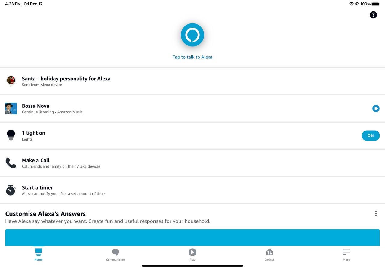 之后,“圣诞老人 - Alexa 的假日个性”技能将出现在您的 Alexa 应用程序主屏幕上。选择圣诞老人 - Alexa 的假日个性以继续。