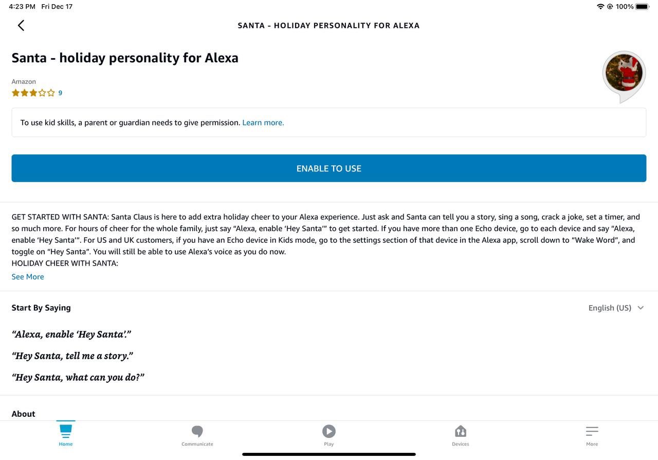 完成后,您可以再次尝试说“Alexa,启用嘿圣诞老人”。然后,等待 Alexa 说:“请允许我欢迎一个非常喜欢假期的人。” 之后,你终于可以和圣诞老人??自己说话了。
