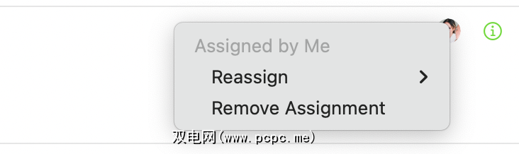 如果您决定从提醒中删除受让人,只需单击受让人按钮旁边的X按钮即可完成此操作。或者,您可以按住 Control 键单击,选择“分配”>“无”,或单击“信息”按钮并从“分配给”弹出菜单中选择“无” 。