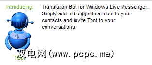 Microsoft为用户,网站管理员和开发人员提供了一系列令人印象深刻的翻译工具,例如Live Translator,但是Windows Live Messenger Translation bot(TBot)的发布去年仍然没有广为人知。使用TBot,您可以与多达13种外语的其他人聊天,甚至可以与TBot本身聊天以练习学习外语。而且,您实际上不需要使用Windows Live Messenger。您可以使用任何喜欢的IM客户端,只要它支持MSN协议即可。让我们看看如何通过3个简单的步骤使用TBot进行外语聊天。