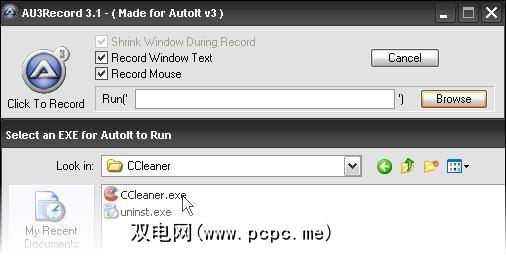 我要做的是运行CCleaner。确保选中记录窗口文本和记录鼠标。单击浏览,然后导航至ccleaner.exe文件。