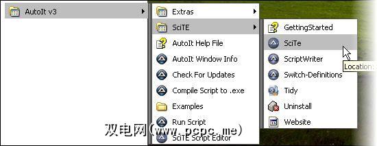 这里的窍门是在我们刚刚下载并安装的那堆东西中打开正确的程序。单击 Windows开始> AutoIt> SciTE> SciTE。。如图所示: