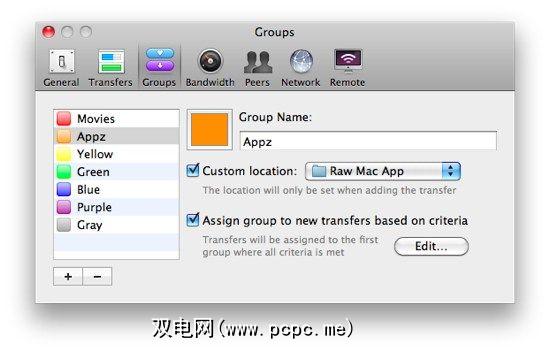 下一步是确定该组的过滤条件。勾选“根据条件将组分配给新的传输"复选框(然后单击“编辑"按钮),您将看到熟悉的Finder式过滤系统。