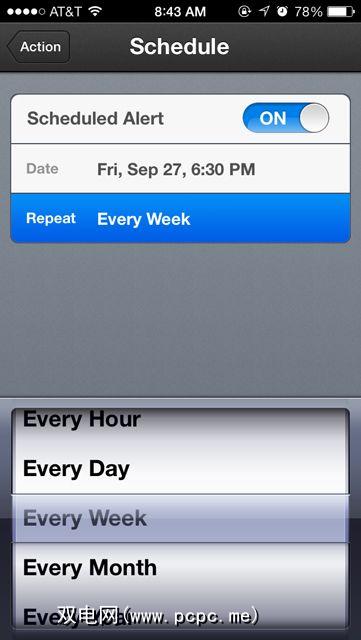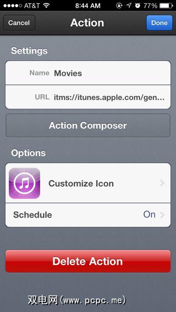 例如,您可能希望设置一种自动化机制来检查iTunes Store的指定部分每周。您选择的操作将被添加到主屏幕。如果要安排该操作,则需要在编辑模式下点击应用程序图标,这会弹出设置。