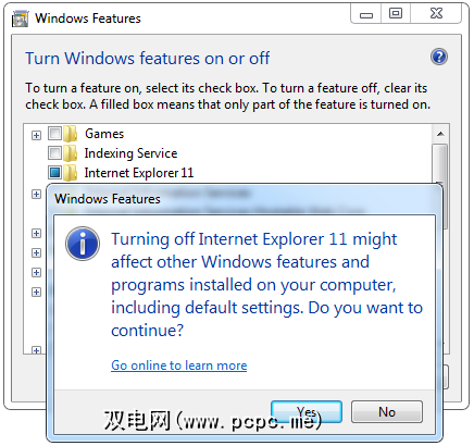 如果您真的想摆脱Internet Explorer,可以删除其用户界面元素。转到控制面板>程序>打开或关闭Windows功能,然后删除Internet Explorer旁边的复选标记。单击确定,等待该过程完成,重新启动计算机,然后IE将消失。