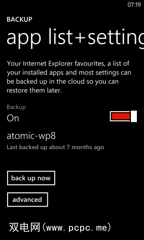 打开设置>备份以查看选项。 应用列表和设置具有一个启用和禁用开关,以及一个立即备份按钮。这两个选项都将数据备份到与Windows Phone关联的SkyDrive帐户。