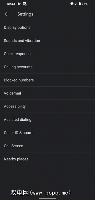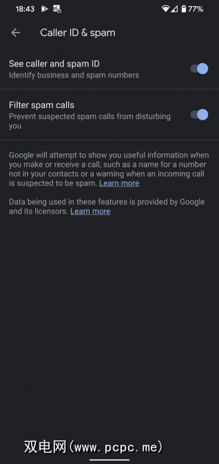 Stock Android的Phone应用程序会警告您有可疑的垃圾邮件发送者,这非常棒。要确保启用此功能,请打开应用程序,然后点击右上角的三点式 Menu 按钮。点击设置,然后选择来电显示和垃圾邮件。启用第一个滑块以在电话响铃时识别垃圾邮件呼叫者。第二个将完全阻止垃圾邮件。