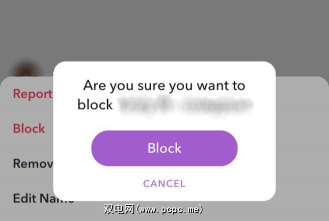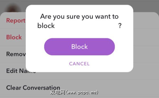 当您按下阻止时,会弹出一个新屏幕,显示“您确定要阻止[用户名]吗?"