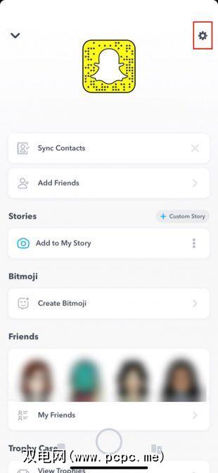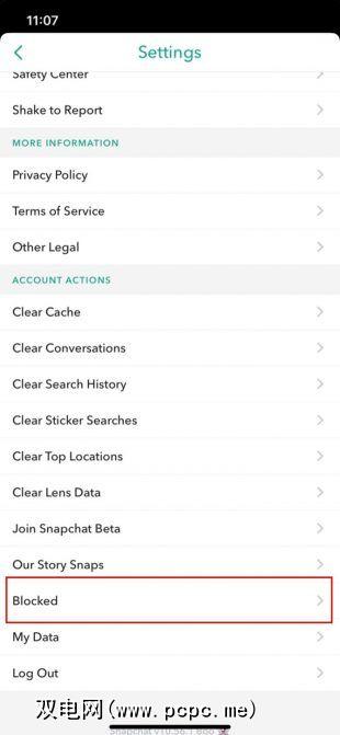 要取消屏蔽某人,请转到您的Snapchat个人资料页面,然后点击设置图标,在右上角。进入该页面后,您将转到设置页面。向下滚动,直到您点击帐户操作部分。