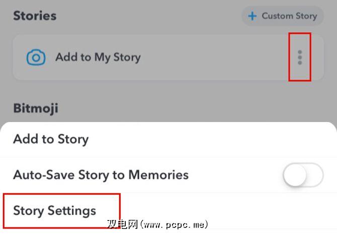 首先,转到您的Snapchat个人资料页面。在故事下,单击三个点以展开“故事"菜单。弹出菜单时,单击故事设置。