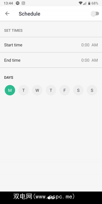 该应用程序还允许您仅在特定时间应用屏蔽功能。点击应用列表上方的时钟图标,您可以选择开始和结束时间来设置阻止。它还可以让您设置时间表在一周中的哪几天。
