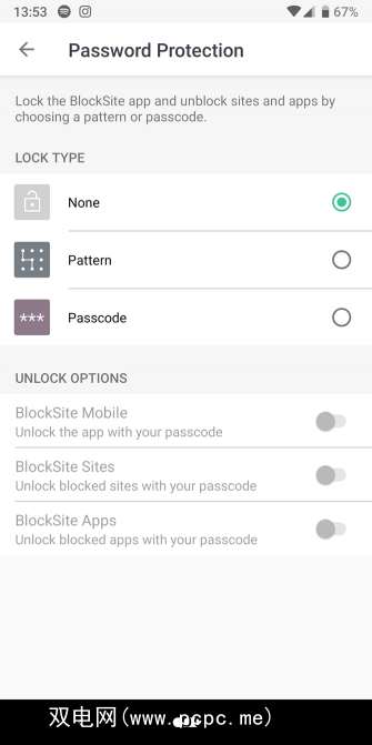 打开右上角的三点式 Menu 并打开设置以获取两个有用的实用程序。如果您在计算机上使用BlockSite,则可以使用 Sync BlockSite 选项来同步您的阻止列表。更重要的是,使用密码保护功能可以防止孩子禁用该功能。您可以设置PIN或模式来保护应用程序安全,并防止更改被阻止的站点和应用程序。