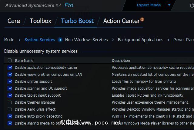 另一个可以尝试帮助优化系统的优秀应用是IObit Advanced SystemCare。我喜欢这个软件,因为它是我发现的少数几个可以加速系统运行的软件之一。关于启动时间,SystemCare中的Turbo Boost功能可以帮助您自动禁用使系统瘫痪的相同类型的启动应用程序和服务,但SystemCare中它的自动化程度更高。
