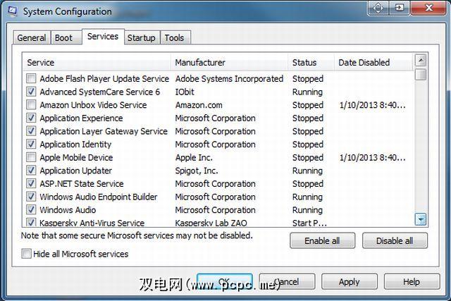下一步是再次运行MSConfig,此类型单击“服务"选项卡。仔细阅读这些内容,并删除您实际上从未打算运行的,作为服务运行的所有内容。您可能会发现已安装并忘记的旧应用程序,或在您不知情的情况下安装的“垃圾"应用程序。取消所有这些选择,然后单击“应用"。