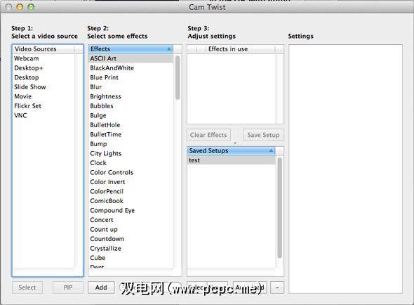 CamTwist的前提是您要添加输入源,和效果,最后生成复合视频,然后您可以将其添加到其他应用程序中-如果需要,可以输入DIY网络摄像头。