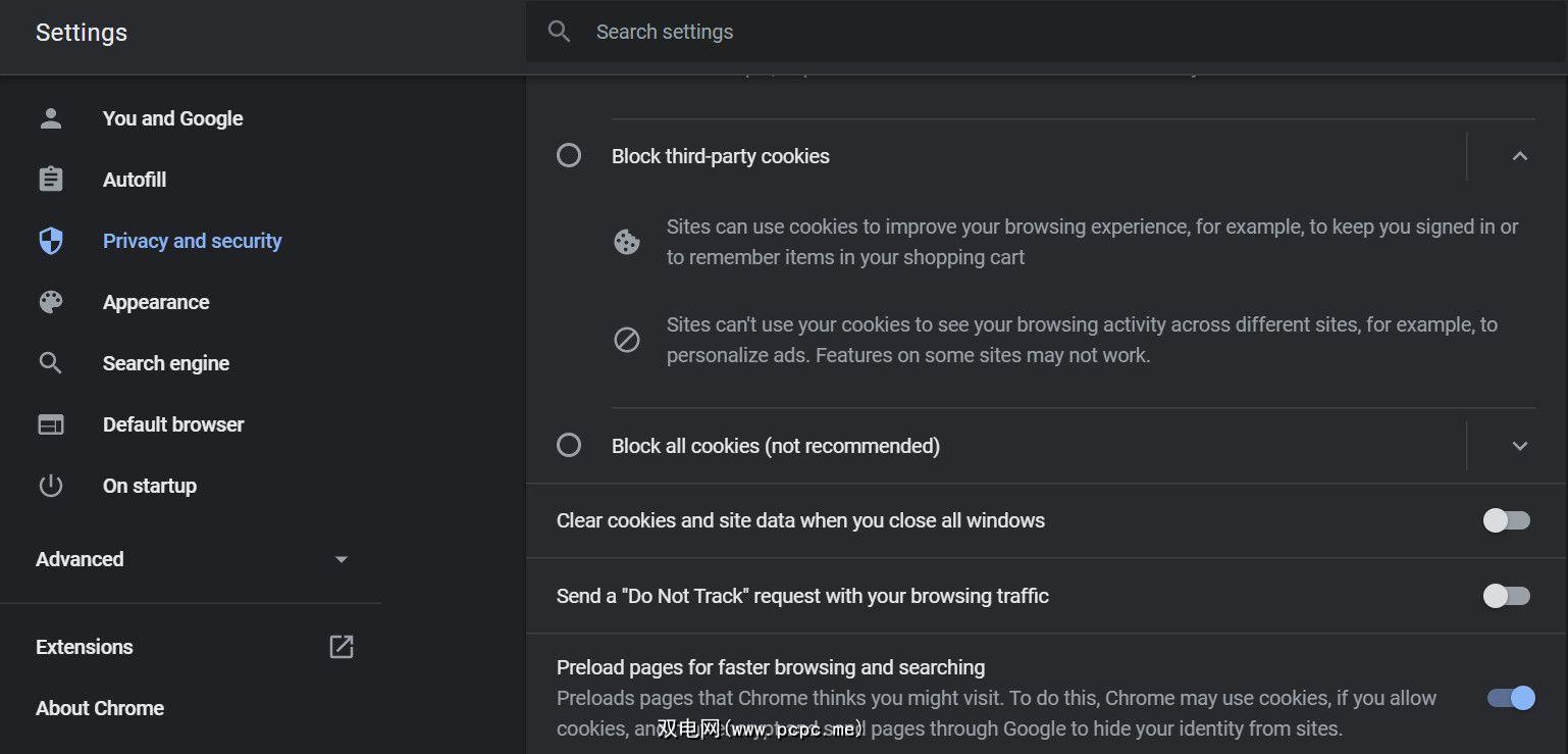 要关闭 Chrome 上的 cookie,请打开设置>隐私和安全,转到Cookie 和其他站点数据,然后选择阻止所有 cookie。