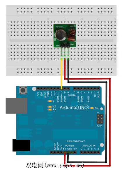 您也可以购买单独的433 MHz发射机,准备在eBay上或从业余电子供应商处使用。您需要做的就是将VCC连接到Arduino上的5 V,GND和一个控制引脚–记住您使用了哪个。 (Willi Thiel的示意图)
