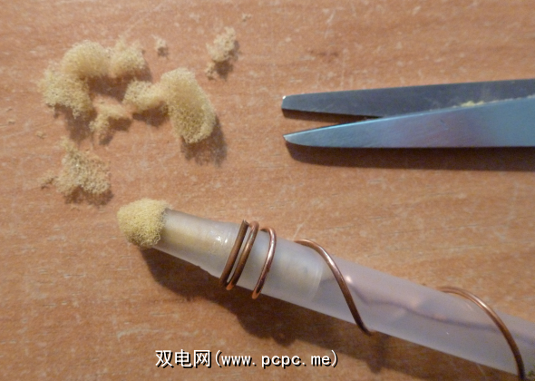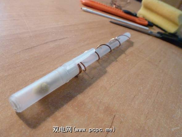 我使用的金属丝的长度约为钢笔的2.5倍并包裹起来它围绕泡沫...