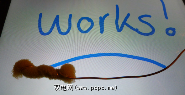 接下来,我首先将导线的一端穿过笔的细尖,然后将导线缠绕在导线的外部。笔,一直到底部。如果需要,可以用一些胶带固定末端。只需确保握住笔时触摸电线即可。下面的屏幕快照显示了用我自己制造的手写笔进行的第一次测试。