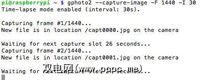 gphoto2 --capture-image -F 1440 -I 30请记住一个怪癖;命令完成后,相机可能会关闭并变得无响应–您需要手动打开电源开关(至少在我的型号上如此)。在使用时,这在现场并不是问题,但是出于测试目的,这非常烦人。如果您知道解决方法,请在评论中让我知道!
