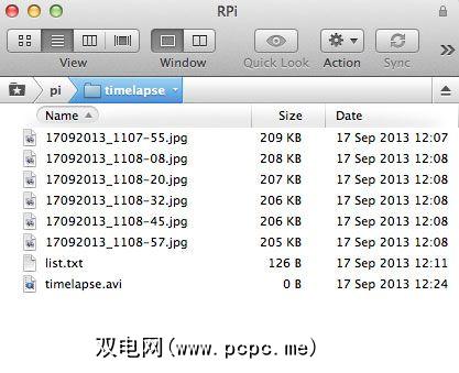 cd timelapsels *.jpg > list.txtsudo apt-get install mencodermencoder -nosound -ovc lavc -lavcopts vcodec=mpeg4:aspect=16/9:vbitrate=8000000 -vf scale=640:480 -o timelapse.avi -mf type=jpeg:fps=24 mf://@list.txt如果一切正常,但您获得了0 KB文件输出,这意味着设备的temp文件夹中没有足够的空间。我以干净的安装方式解决了这个问题,并再次扩展了根系统-BTSync似乎弄乱了一些临时文件。