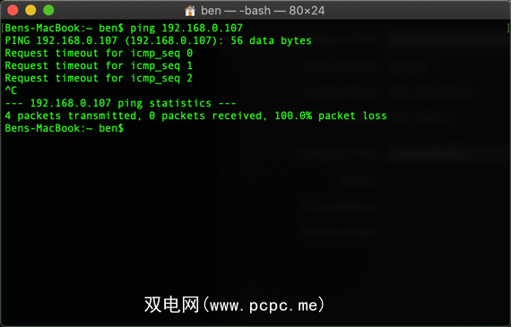 如果这导致从192.168.0.102到 64个字节之类的消息,然后显示其他信息,则表示具有该地址的设备已存在于您的网络中,并且正在响应您的ping。不要在Mac上使用该地址;尝试使用新地址重新尝试 ping ,直到找到可用的地址。