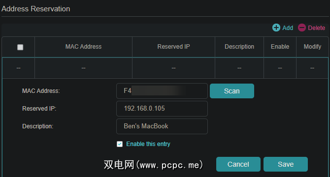 IP地址保留选项会因您的路由器而略有不同。例如,在现代TP-Link路由器上,您可以在高级>网络> DHCP服务器下找到这些选项。在地址保留部分中,单击添加,然后您需要指定Mac的 MAC地址。