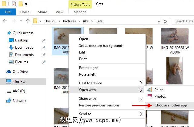 假设您要更改JPEG图像的默认查看器。右键单击PC上的任何.JPG文件,然后选择打开方式>选择另一个应用程序。