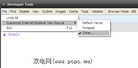 IE8的源查看器,从 View – Source 访问的内容除了标准选项外没有添加任何其他内容。但是内置的 Developer Tools 功能为IE8增添了很多吸引力,这是我们选择编辑器的一种选择。